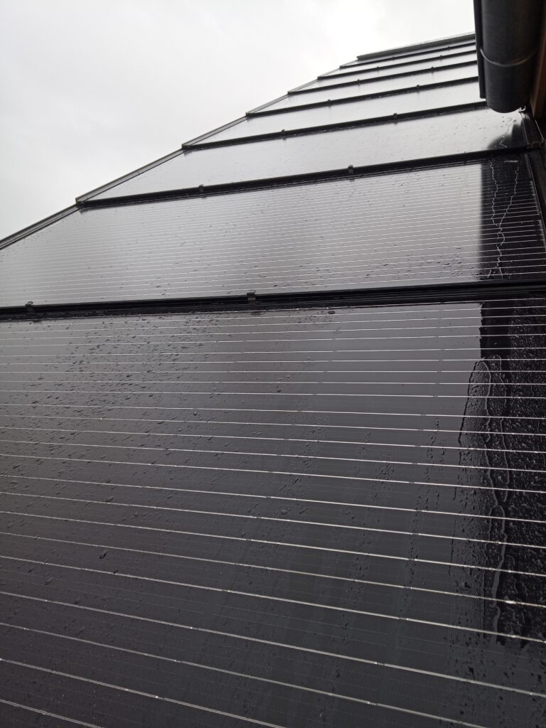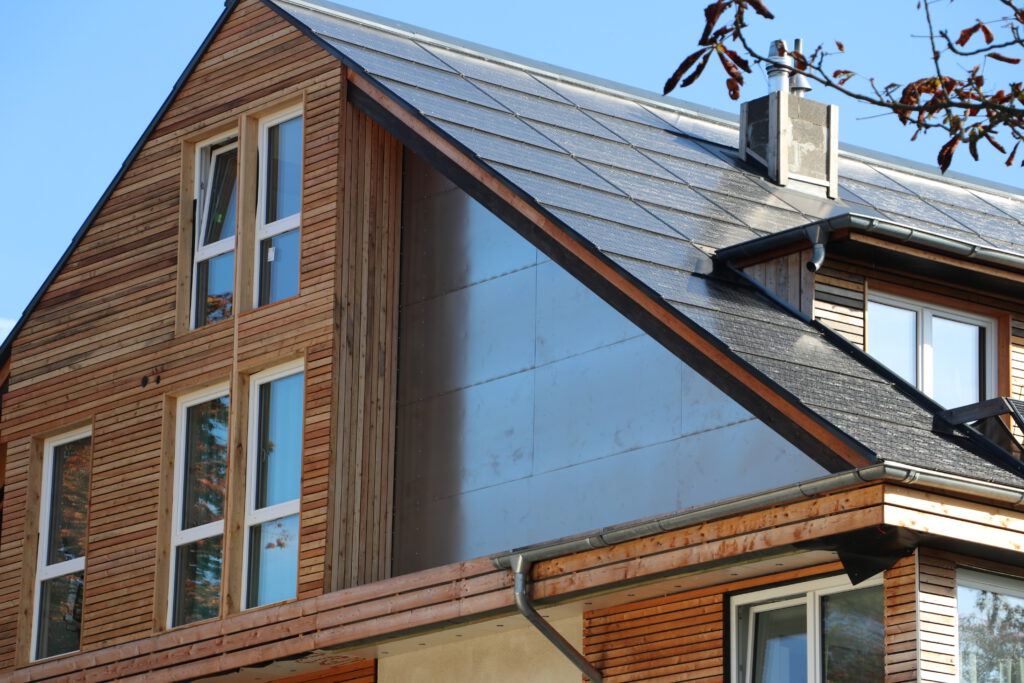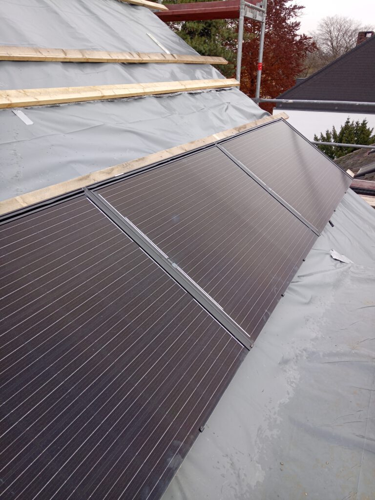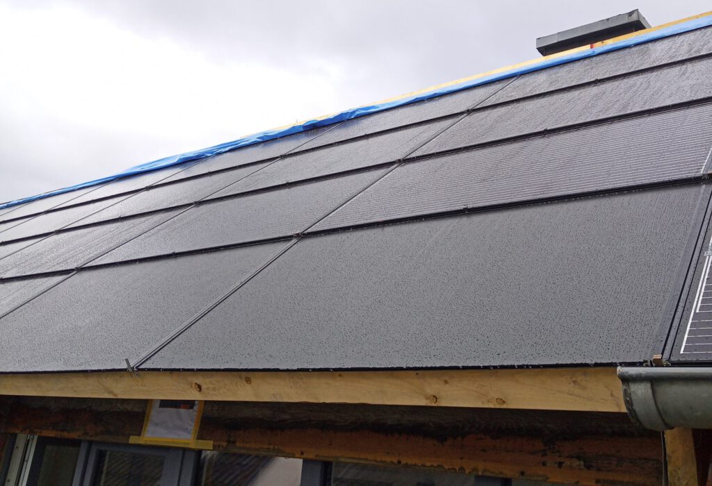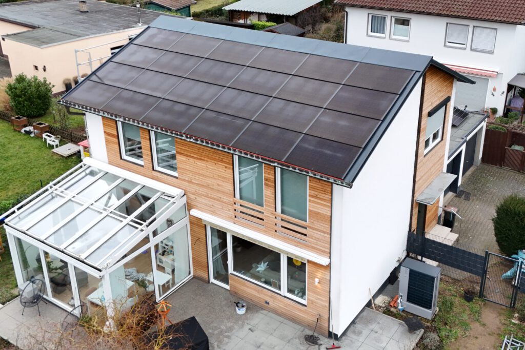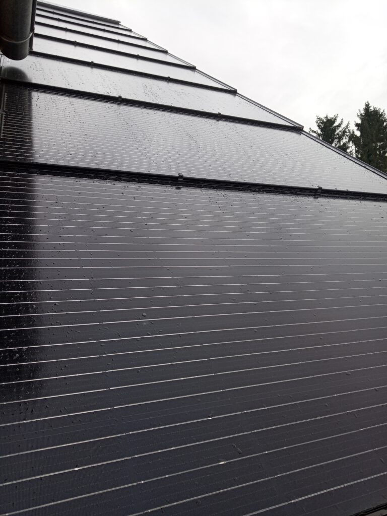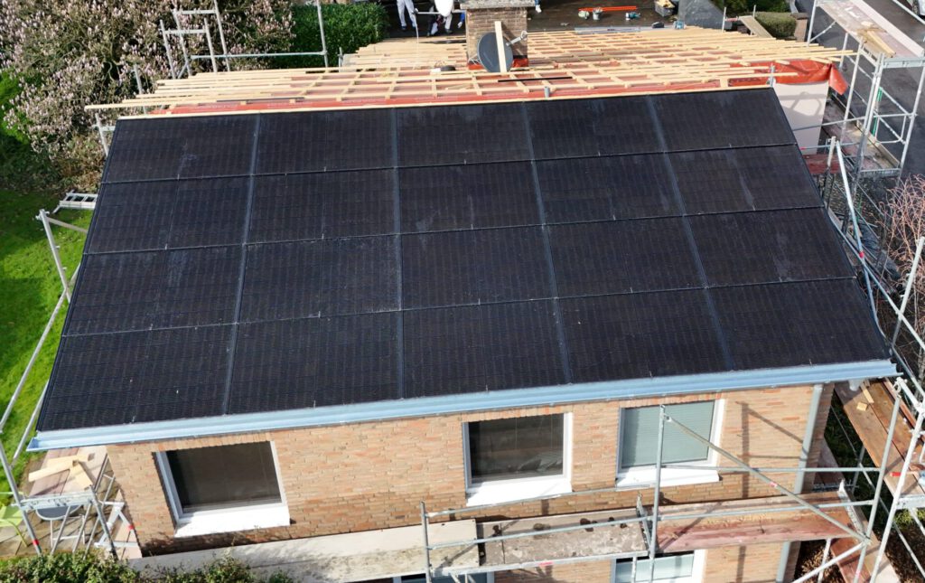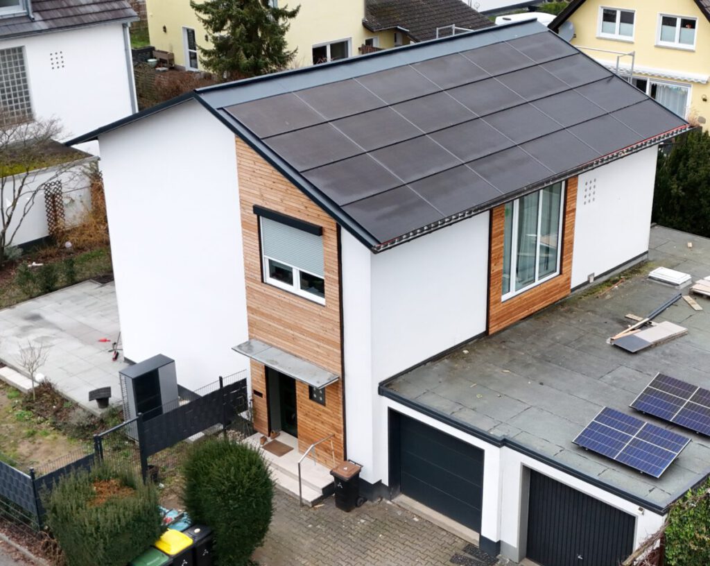 Der Bauherr wollte eine integrierte Dachanlage mit möglichst hoher Leistung. Aus Gründen der Nachhaltigkeit und Effizienz sollte auf eine klassiche Ziegeleindeckung verzichtet und die gesamte Dachfläche als Solargenerator verwendet werden. Insgesamt wurde gut 120 Module auf beiden Dachseiten verbaut, sodass die Anlage von Sonnenaufgang bis Sonnenuntergang kontinuierlich Strom liefert und insbesondere die Verbrauchsspitzen morgens und abends abgedeckt werden. Mit einer gut dimensionierten Speicherlösung kann ein Autarkiegrad von fast 80 % erreicht werden. Diese Anlage ist darüber hinaus äußerst wirtschaftlich, weil die Kosten der klassischen Dacheindeckung vermieden wurden.